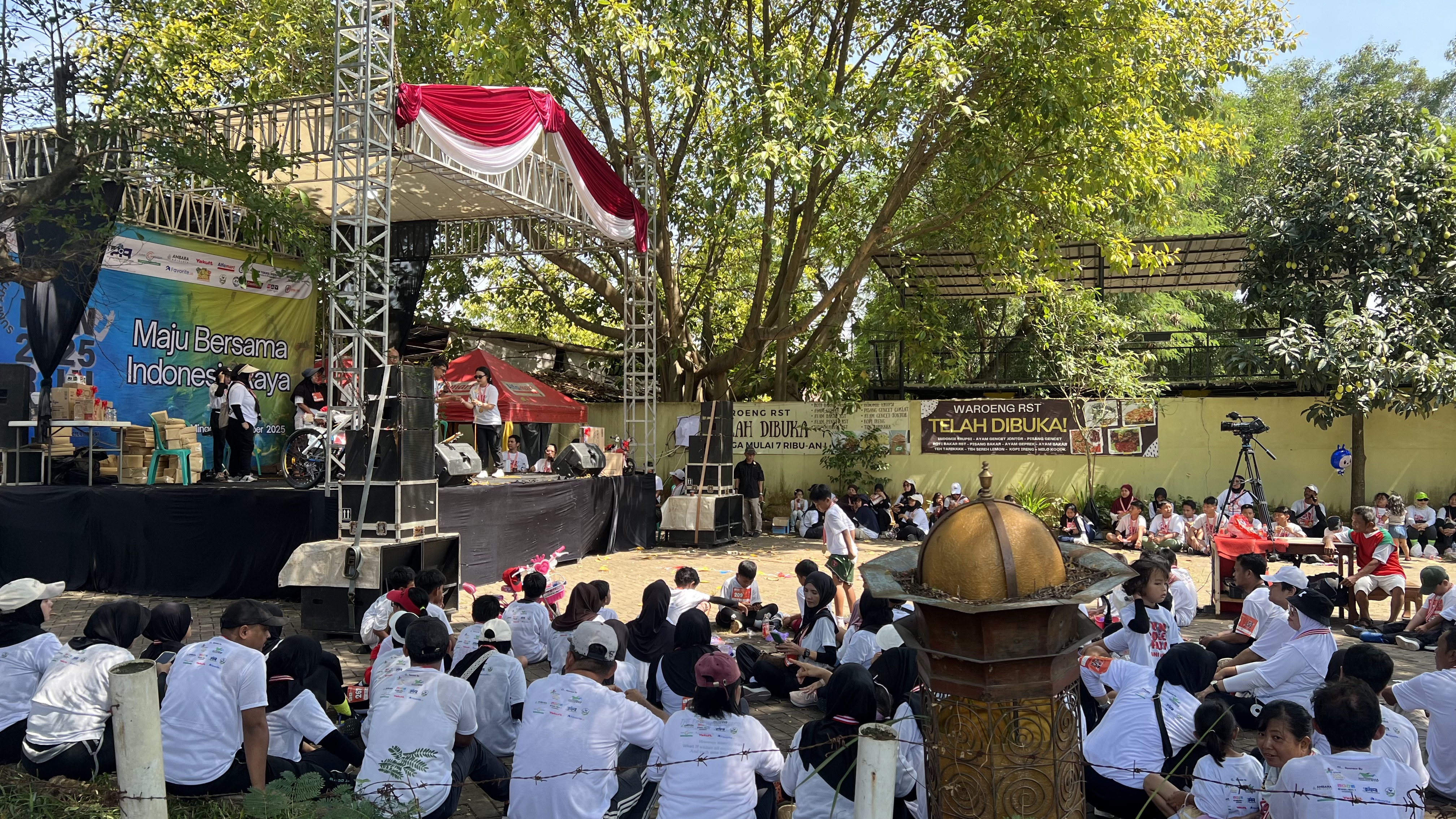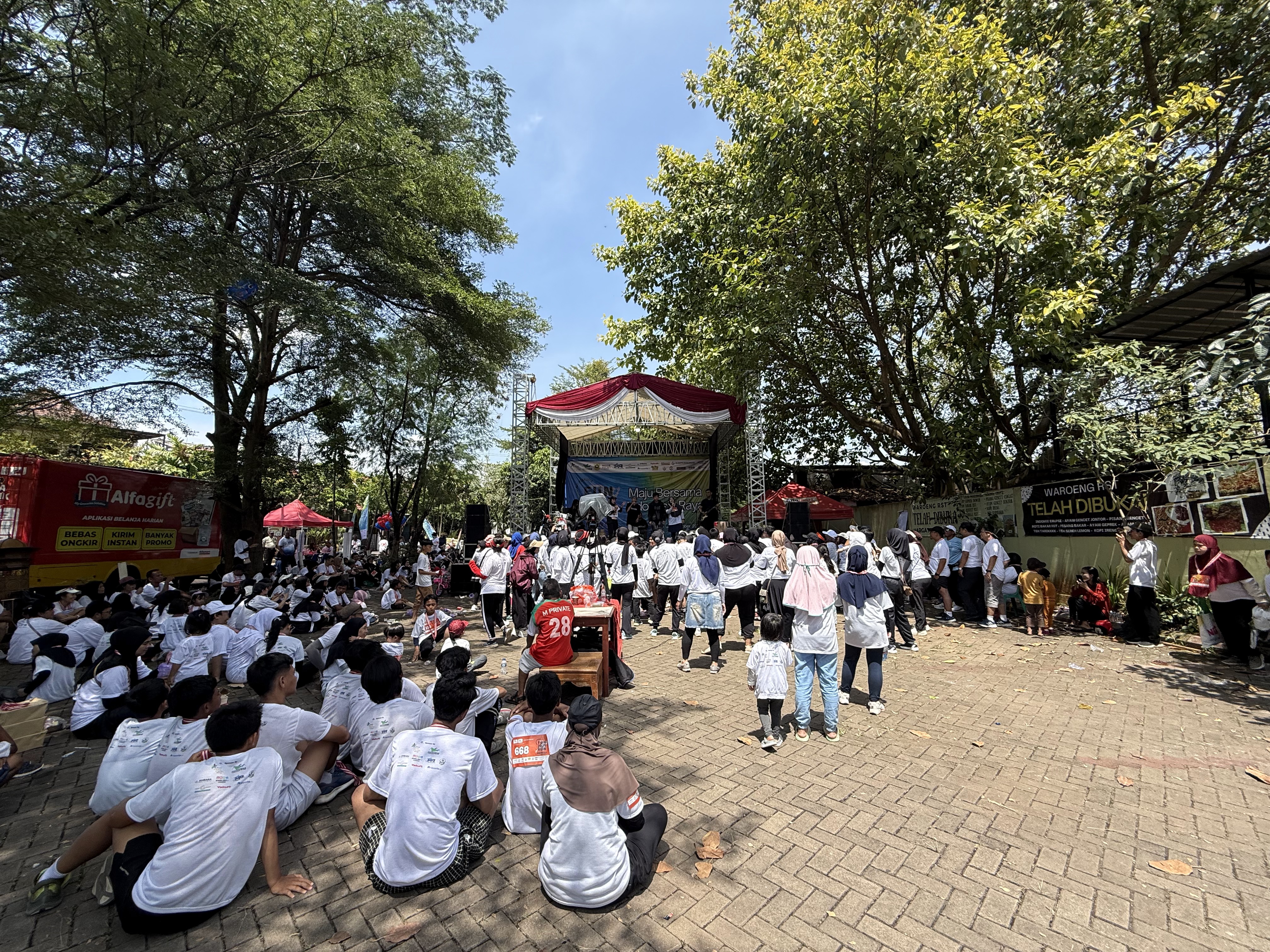 After completing the running route, all participants gathered back at the main stage area for various exciting activities. The area was adorned with a large backdrop featuring the theme “Maju Bersama Indonesia Raya” and sponsor banners, creating a lively festival atmosphere.